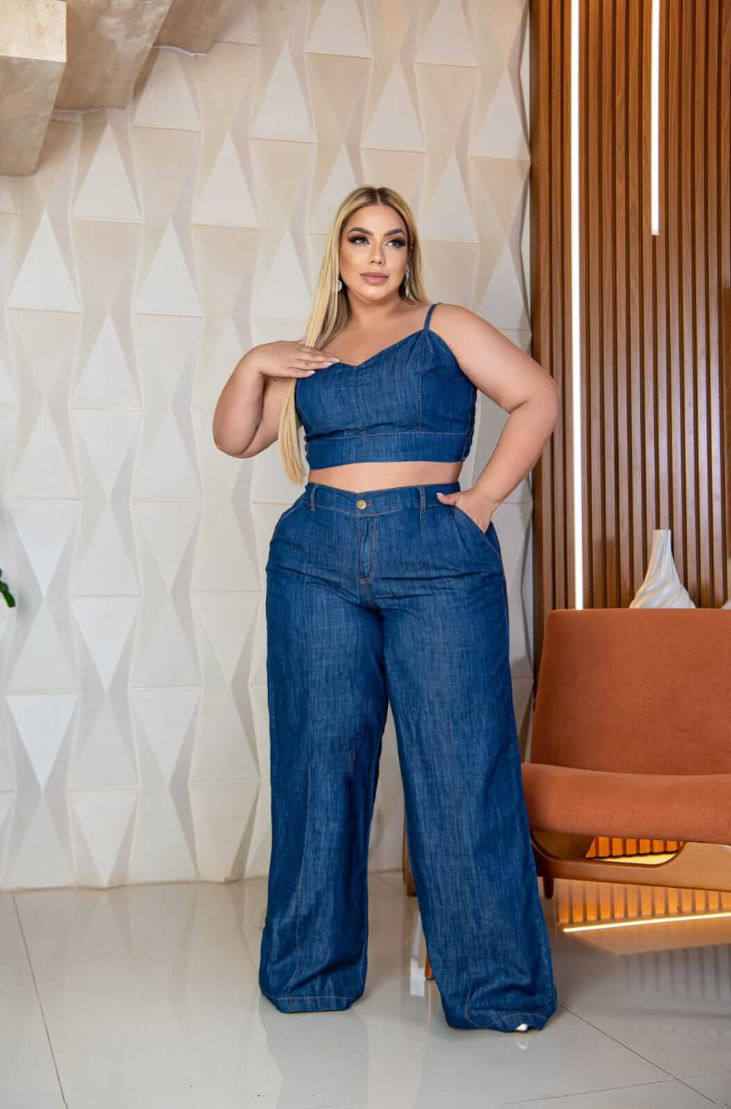 Conjunto Plus Size Calça Pantalona e Cropped Jeans