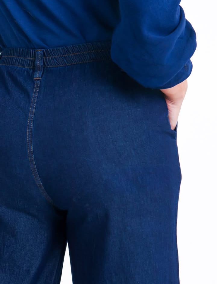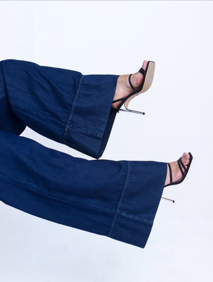 Com modelagem wide leg e recorte estilo pantalona, esta calça une o clássico do jeans com um visual contemporâneo e imponente. O detalhe na barra dá o charme final, elevando qualquer look com personalidade.