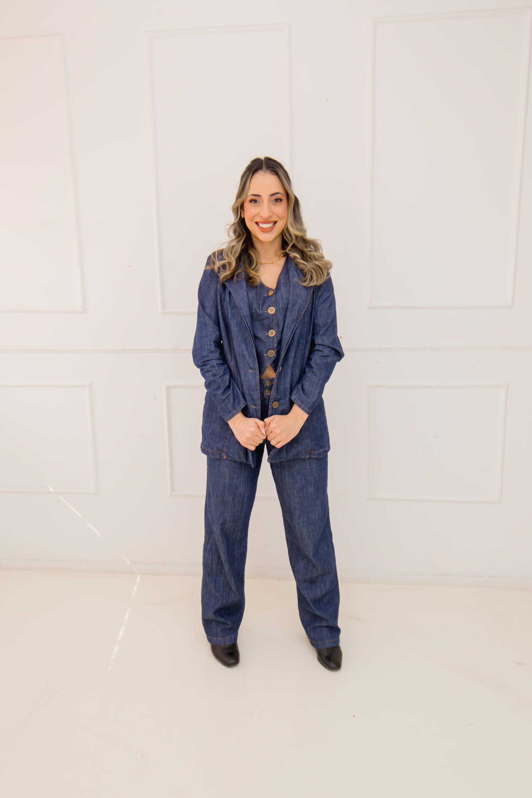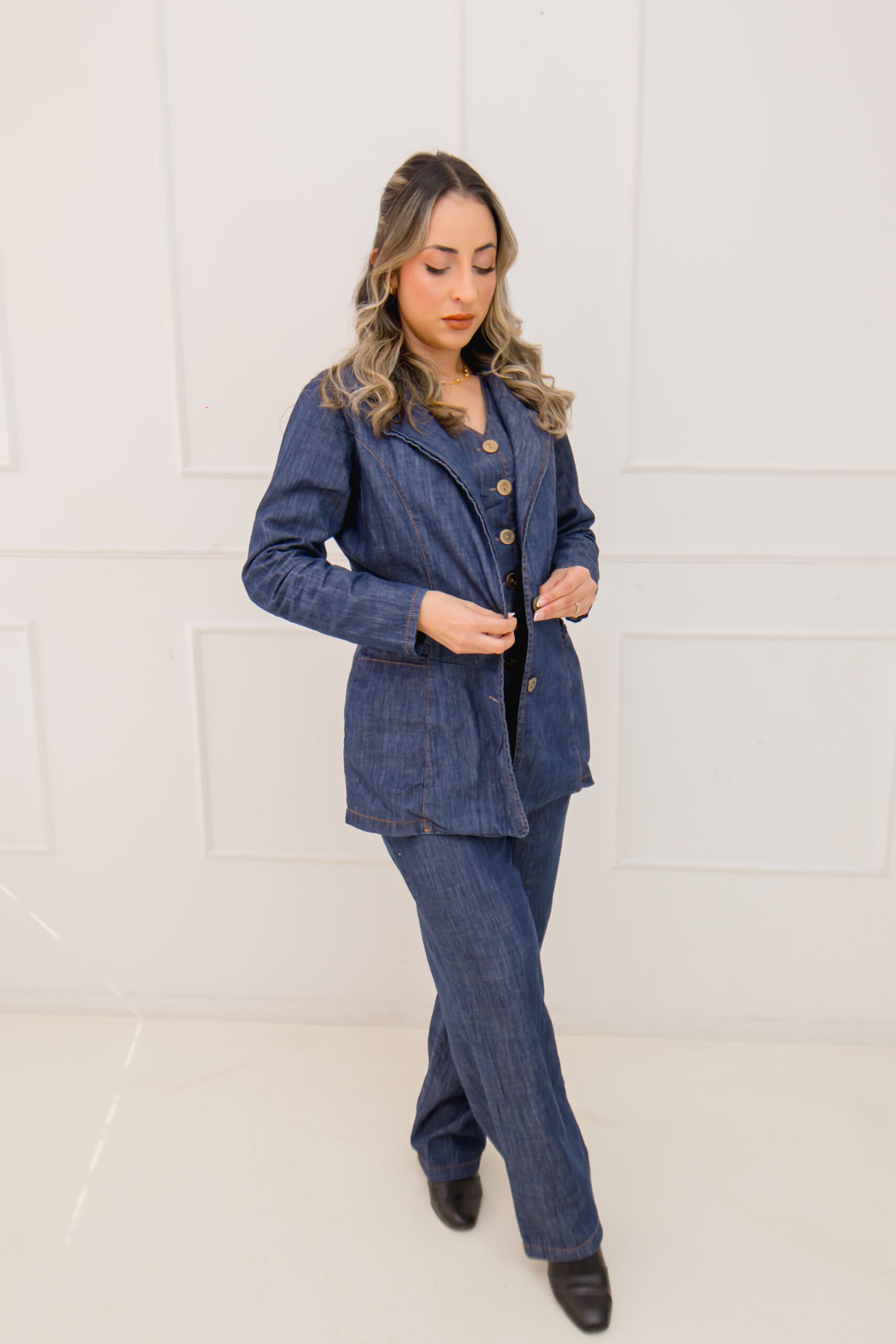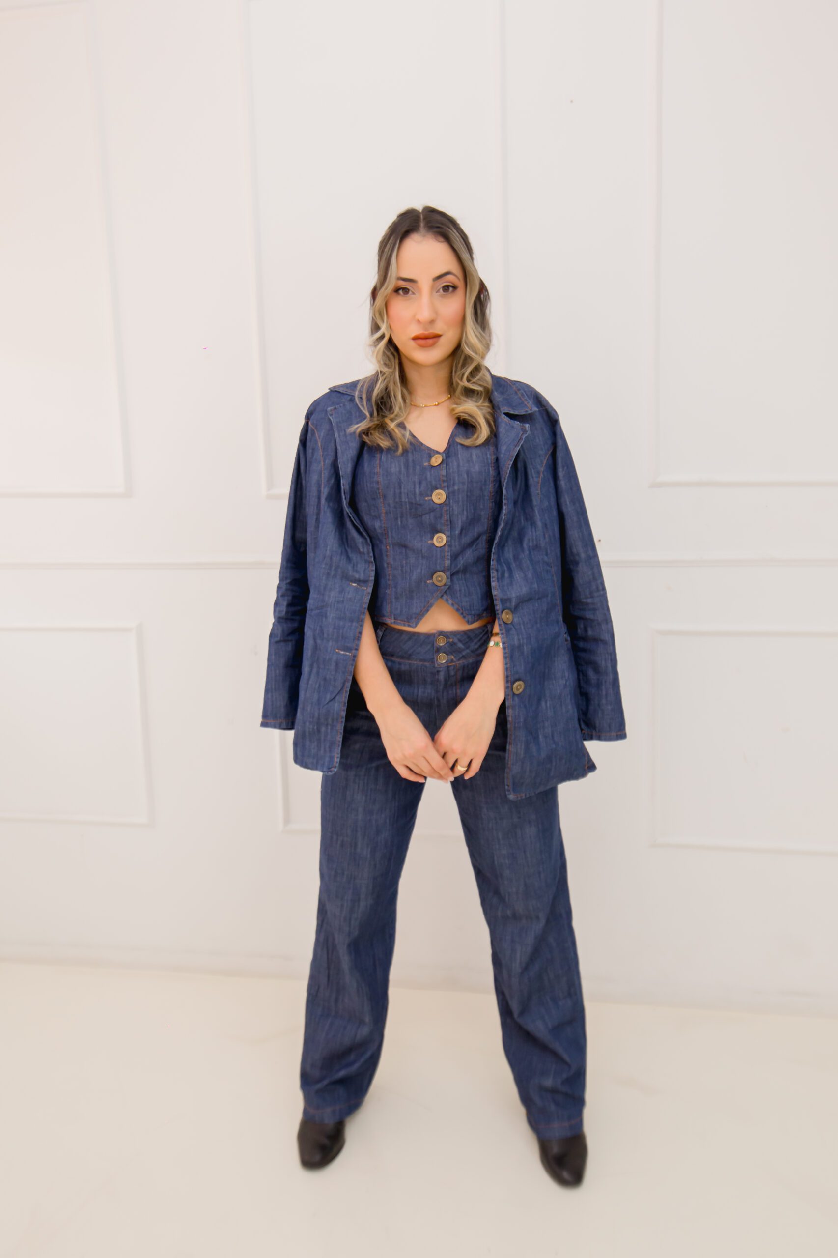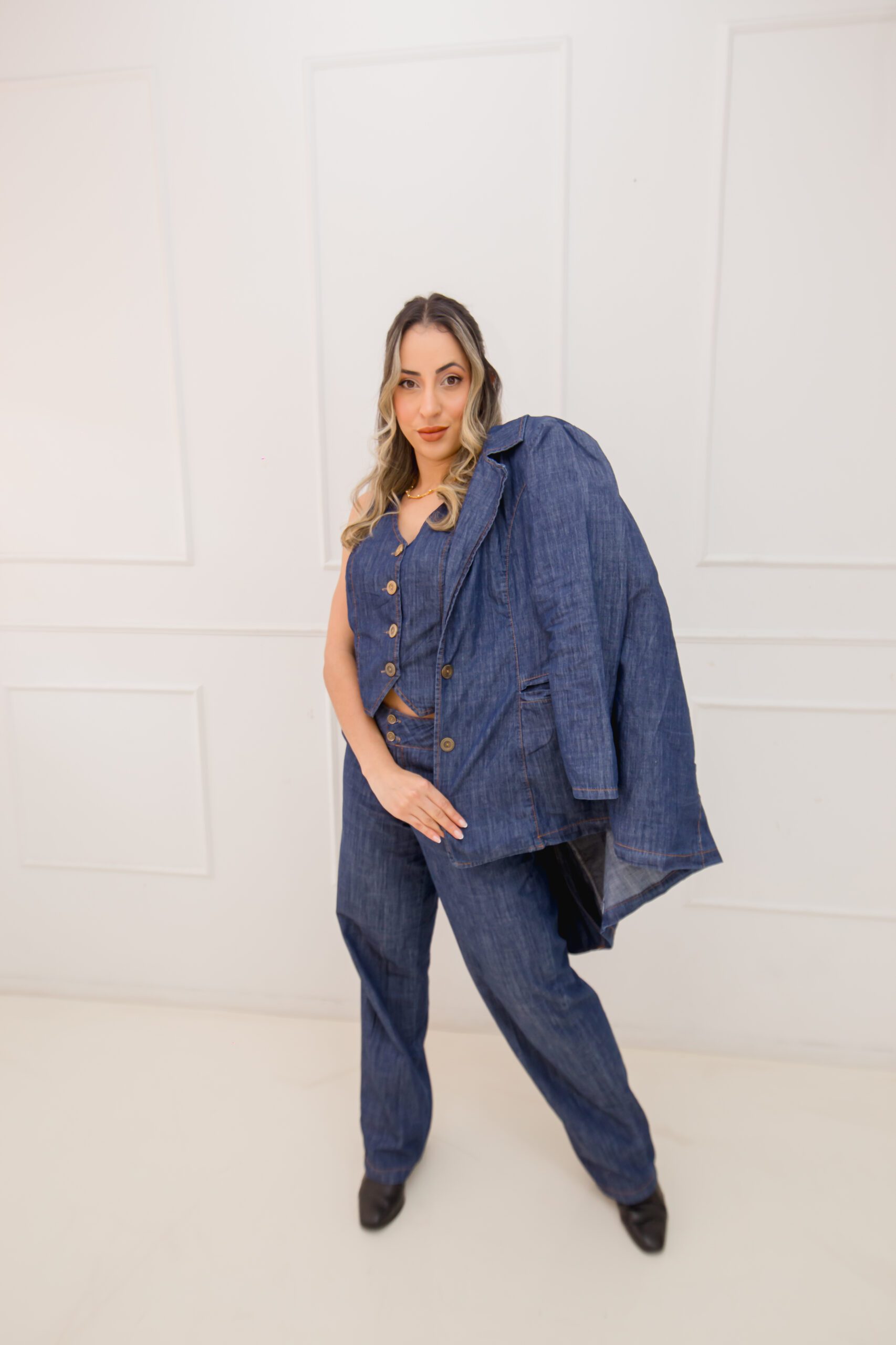 Conjunto Jeans Completo: Calça Pantalona + Blazer + Colete — Elegância e Estilo em um Só Look 💙