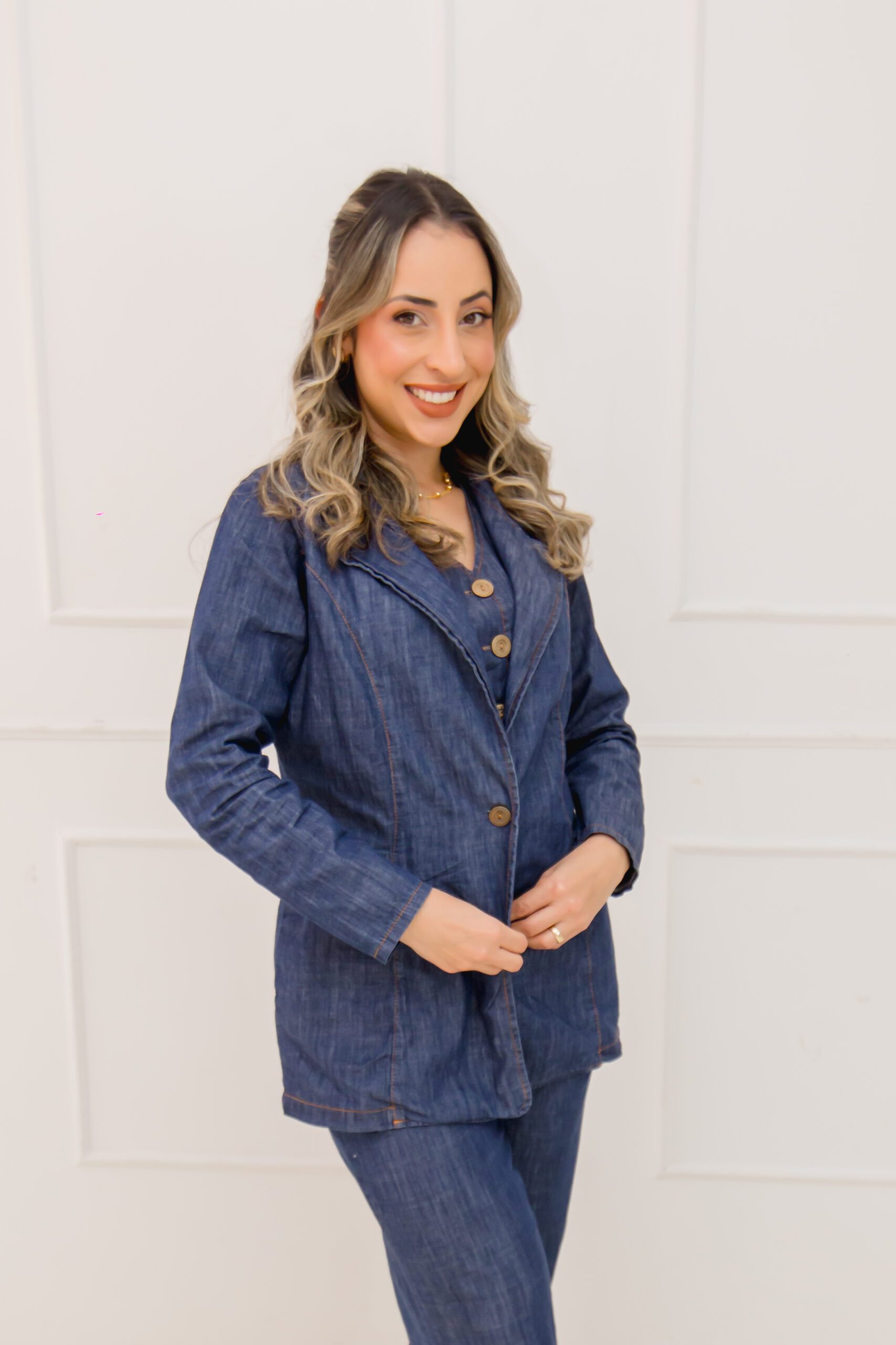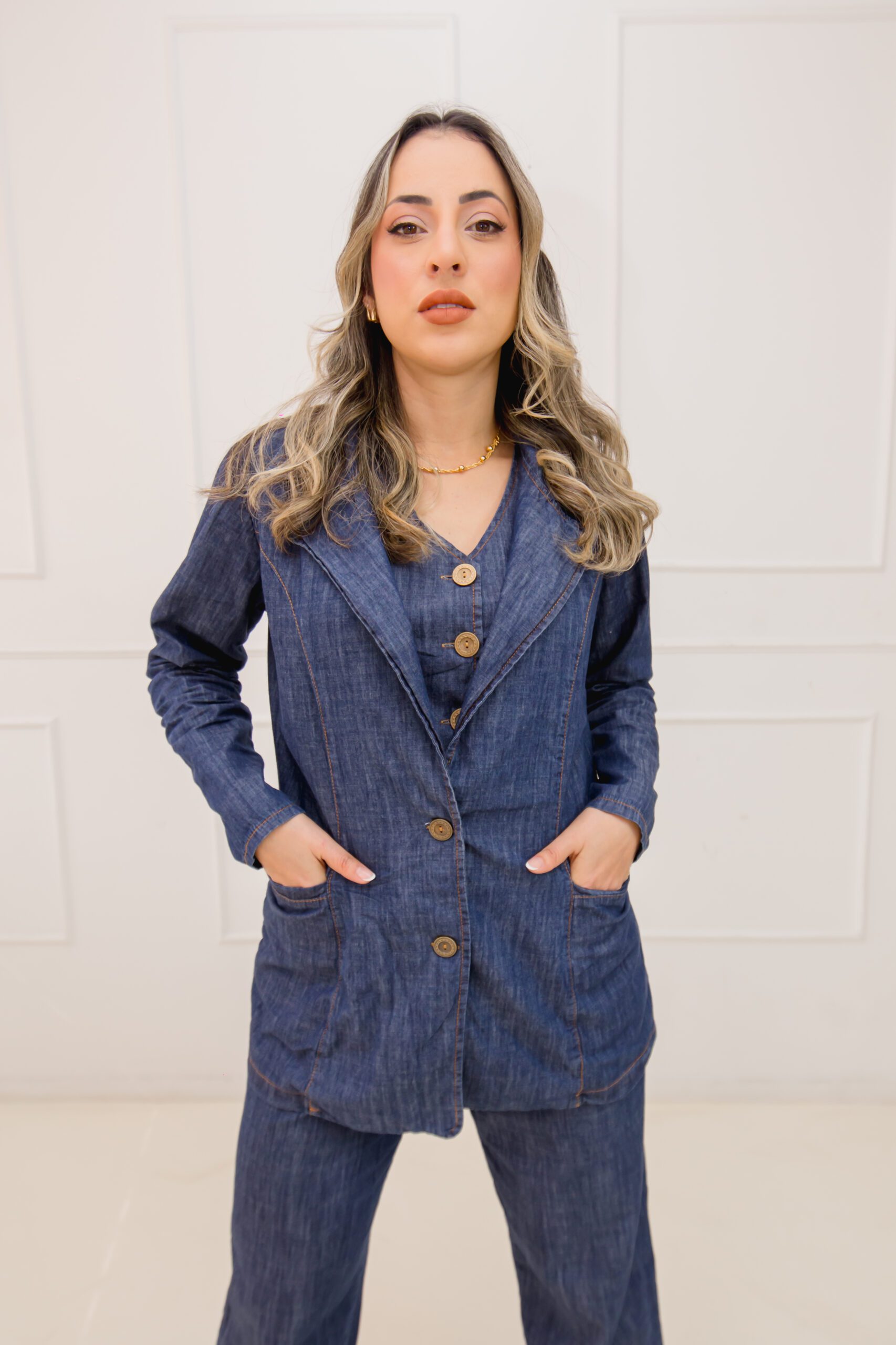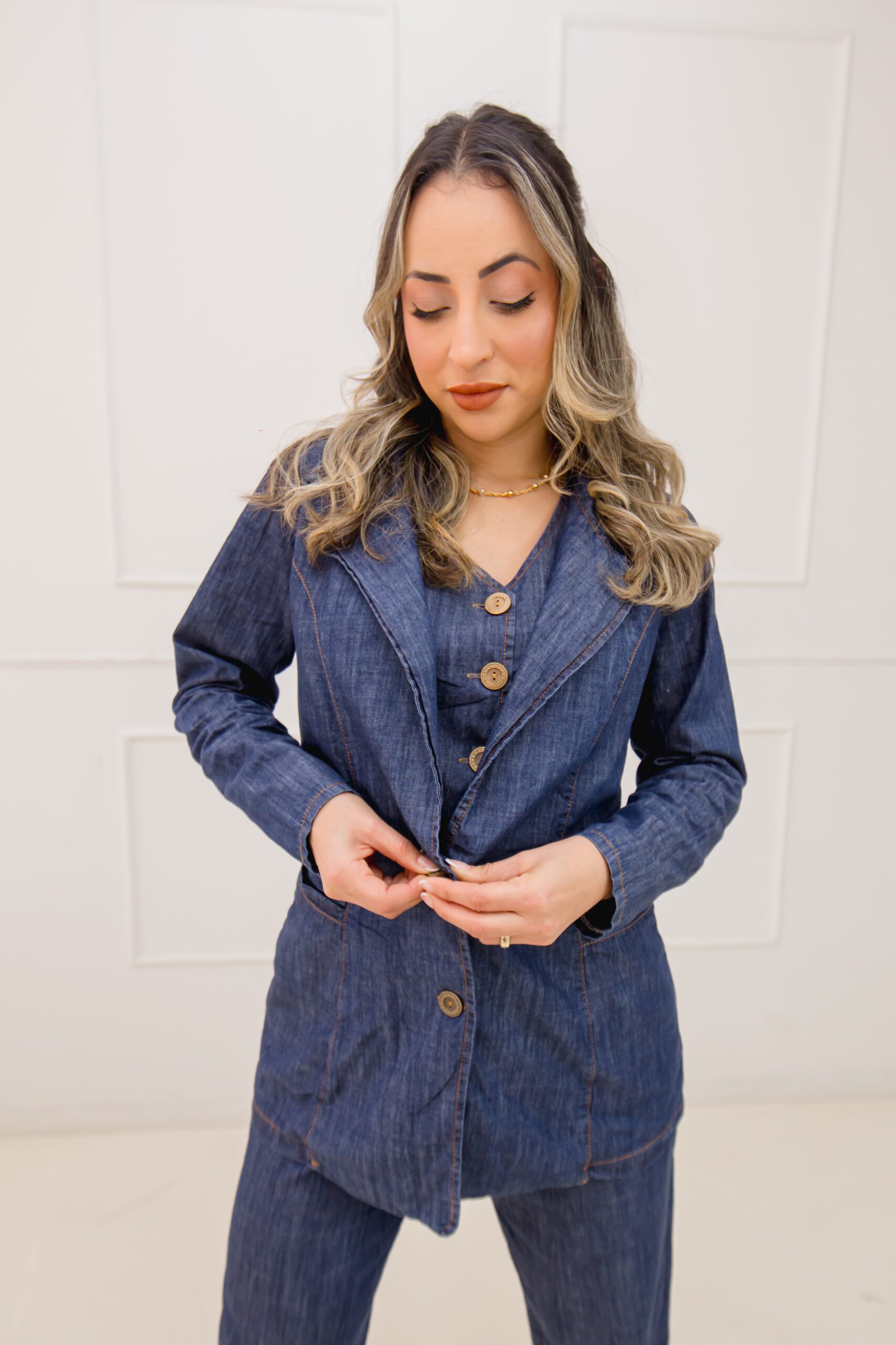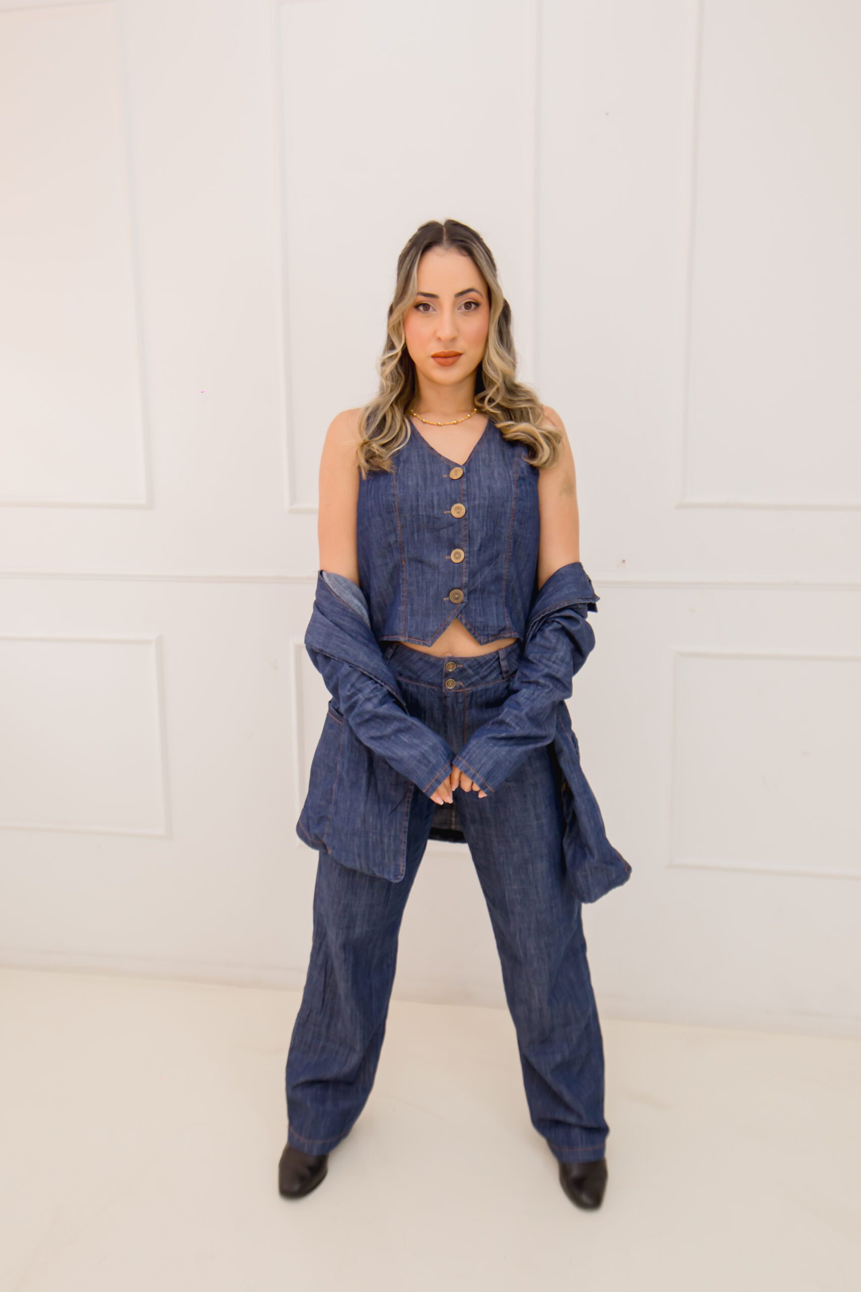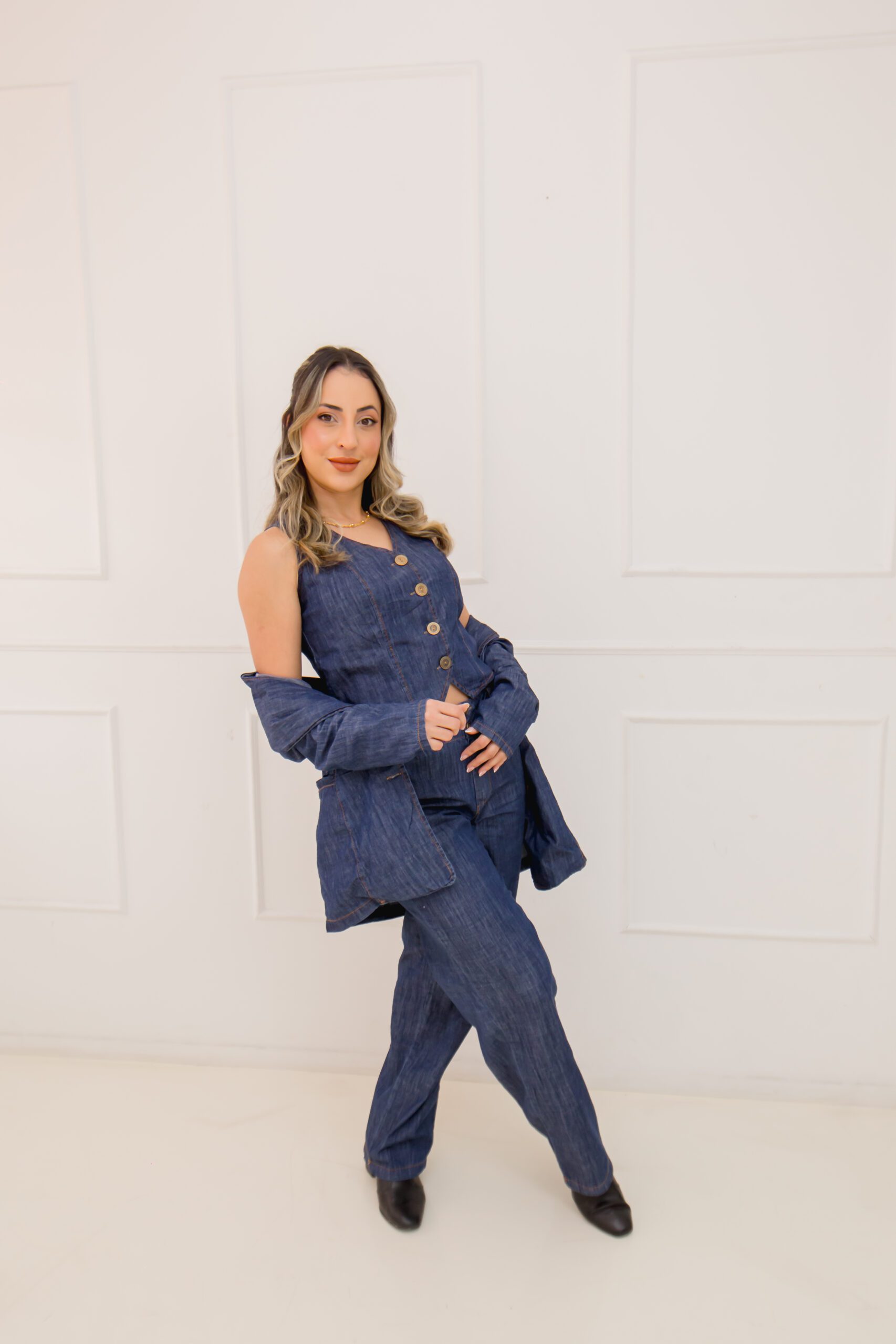 Conjunto Jeans Completo: Calça Pantalona + Blazer + Colete — Elegância e Estilo em um Só Look 💙