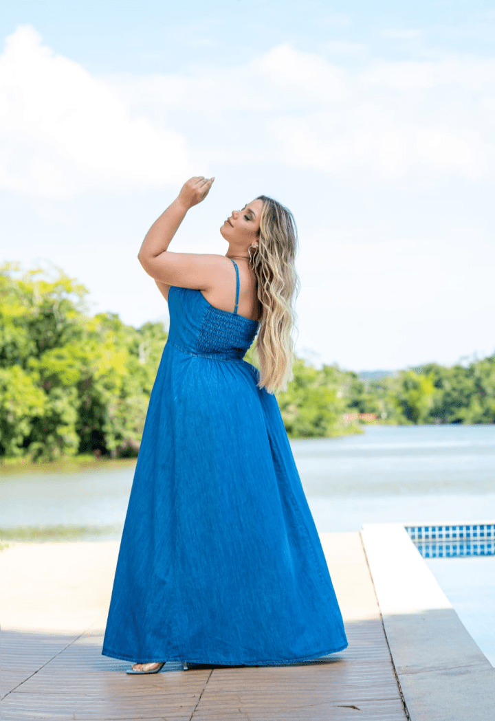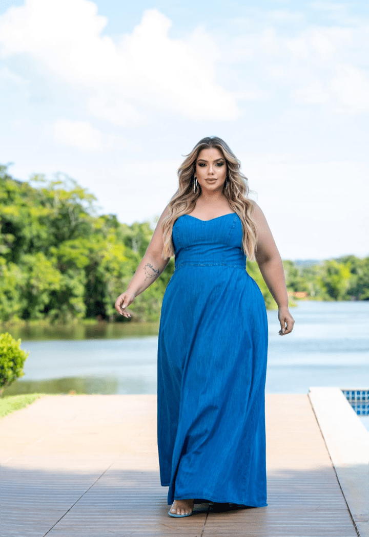 O Vestido Jeans Longo Plus Size com alça ajustável é a escolha ideal para compor looks casuais sofisticados e que valorizam suas curvas com charme.